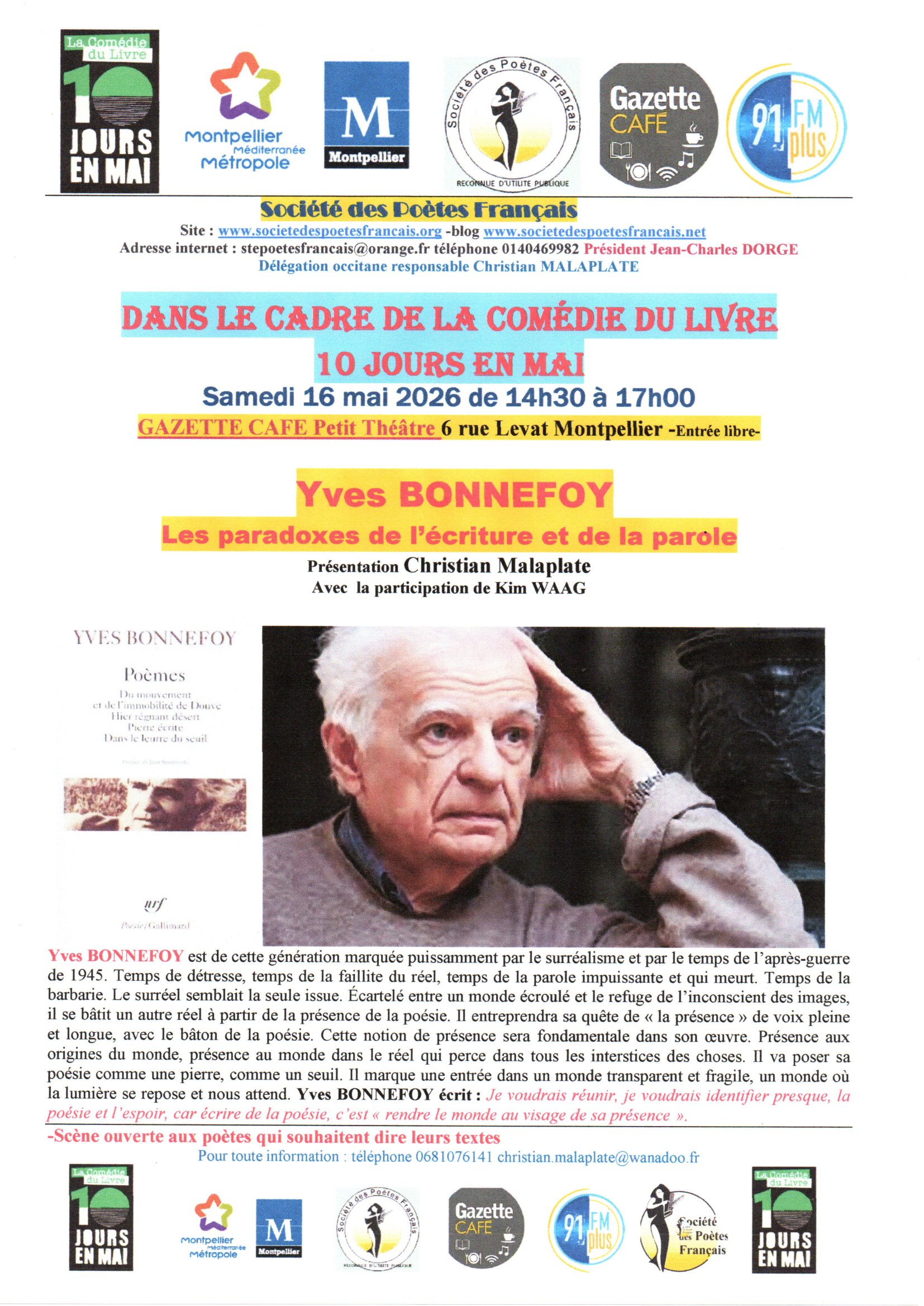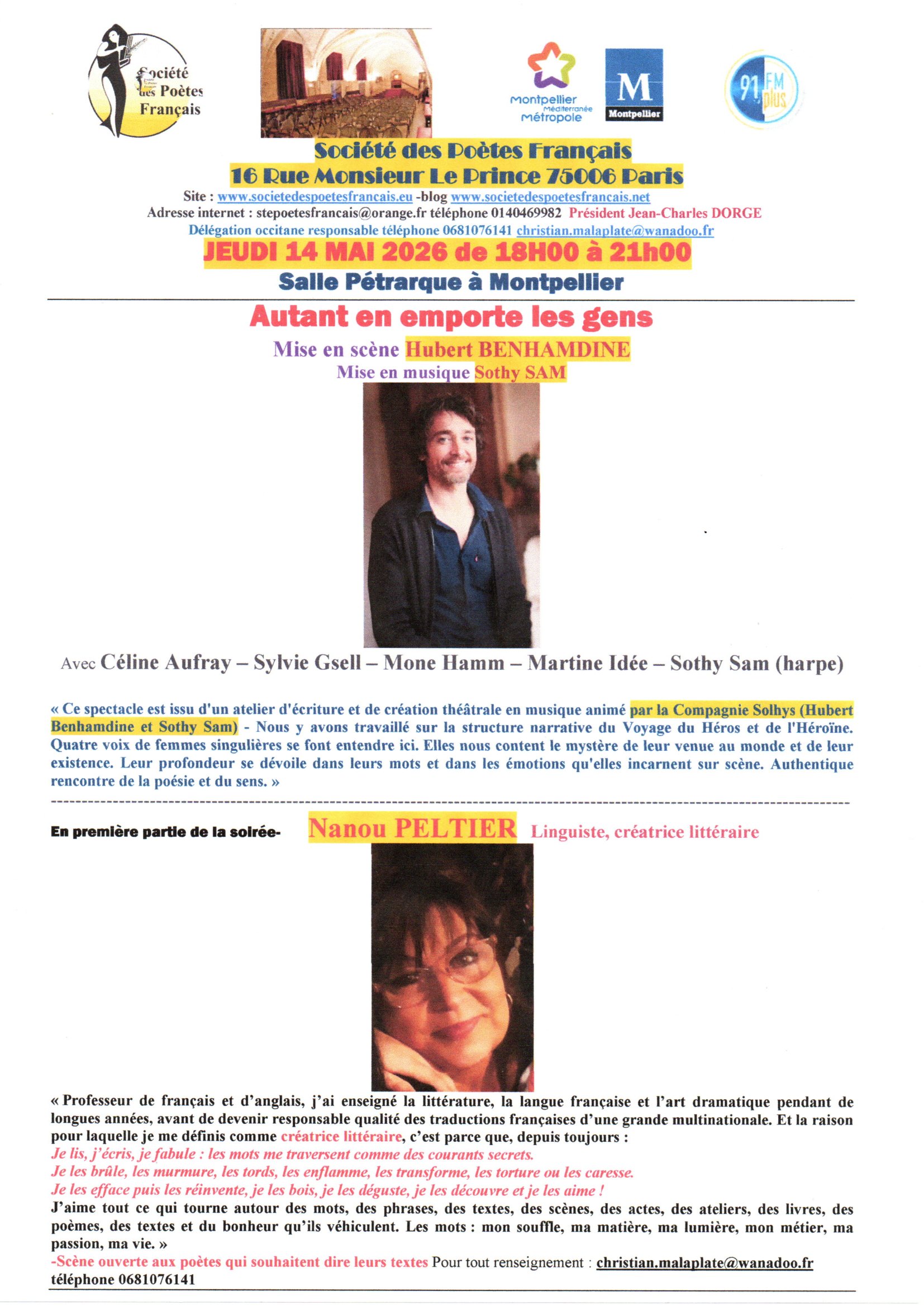 Bonjour à toutes et à tous La délégation occitane de la Société des Poètes Français -organise une soirée de poésie -Vous êtes cordialement invité(e) JEUDI 09 AVRIL 2026 de 18H00 à 21h00 Salle Pétrarque à Montpellier Collocation poétique Sébastien BIDAULT et Didier SAINT-JEAN Entre une poésie toujours libre présentée par Didier SAINT-JEAN et la poésie rimée de Sébastien BIDAULT- Didier SAINT-JEAN écrit « la poésie est venue à moi au commencement d’un voyage intérieur il y a 18ans, l’aventure pouvait commencer ». A publié dans des revues et dans des anthologies – Actuellement 3 recueils sont prêts pour être édités: Couleurs des mots, Poussières d’Anges et Un autre temps. En 2026 il est édité sur le site des amis des jardins des plantes de Montpellier- Exerce la profession de jardinier – propriétaire d’un jardin de 1600m2 à Claret, le jardin de la Taillade qui au bout de plusieurs années est devenu un jardin botanique, botanique par sa diversité éclectique, avec à ce jour 700 représentants du monde entier ainsi qu’une collection de 49 espèces de phlomis. Sébastien BIDAULT Comédien, joue dans diverses pièces de théâtre contemporaines ou sur des textes de Tchekhov, Sade, Chouaki. Auto-produit trois courts-métrages- Des petits rôles dans des longs-métrages à son actif- Réalise des performances avec les poèmes de Michel Houellebecq- Écrit de la poésie et publie d’abord sur internet. Les revues Lichen, Sitaudis, Le pot à mots, Phoenix et Les carnets d’Eucharis ont publiés certains de ses poèmes. -Scène ouverte aux poètes qui souhaitent dire leurs textes Pour tout renseignement : christian.malaplate@wanadoo.fr téléphone 0681076141